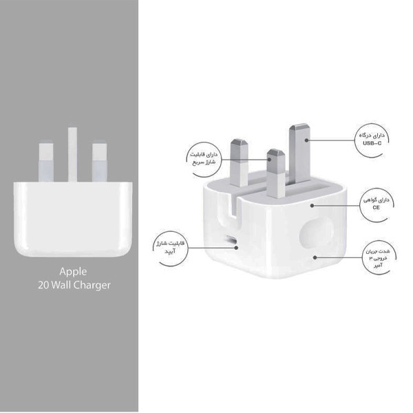 توان خروجی در این مدل از شارژرهای دیواری «اپل» 20 وات است. همچنین جریان خروجی در آن 3.0 آمپر شدت دارد و برای شارژ باتری انواع گوشیهای موبایل، دوربین دیجیتال و دیگر لوازم از این قبیل مناسب خواهد بود. در این شارژر دیواری یک سه شاخه برق قرار گرفته که از آن برای اتصال شارژر به پریز برق استفاده میشود. البته توجه داشته باشید که این سه شاخه با پریز برق در ایران سازگاری ندارد و شما برای استفاده از آن باید از یک تبدیل 3 به 2 استفاده کنید. پس از استفاده از این تبدیل، شما میتوانید شارژر را بهطور مستقیم به پریز برق متصل کرده و دستگاه مورد نظر خود را با کمک یک کابل USB به آن متصل کنید. ولتاژ ورودی در این شارژر 220 تا 240 ولت و ولتاژ خروجی در آن 20 ولت است. وزن این شارژر 80 گرم بوده و ابعاد آن بهصورتی طراحی شده که بهسادگی قابل حمل باشد.